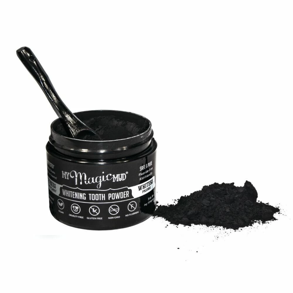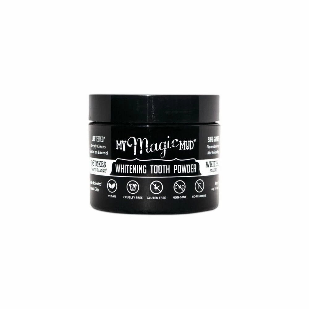 My Magic Mud TandpoederMy Magic Mud Tandpoeder is een 100% natuurlijke en veilig tandpoeder. Dit poeder maakt de tanden en kiezen in korte tijd zichtbaar witter Het tandpoeder bevat een korrelvrije, ultrafijne granulaat die zacht is voor het glazuur. De actieve stoffen zijn actieve kool (uit kokosnootschillen) en bentonietklei.De actieve kool scrubt tanden en ontgift de mond. De calciumbetonietklei verbetert de mondhygiëne en hersteld het glazuur. De aanwezige muntextract en sinaasappelschil-ex